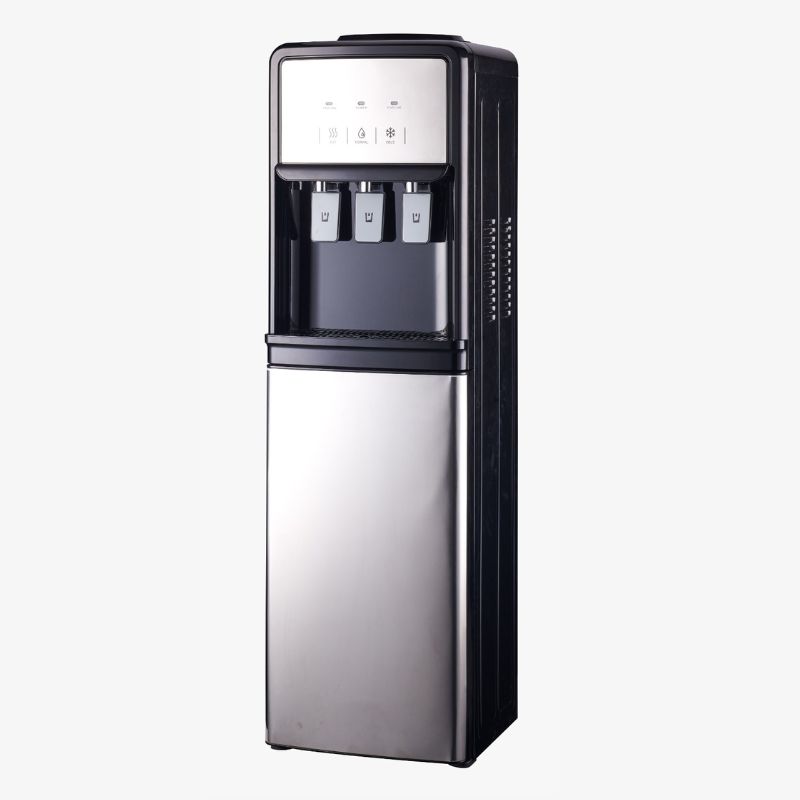 Premium bottom-loading water dispenser with hot, cold & normal water options, featuring hot water safety lock and elegant black + stainless steel decoration door.