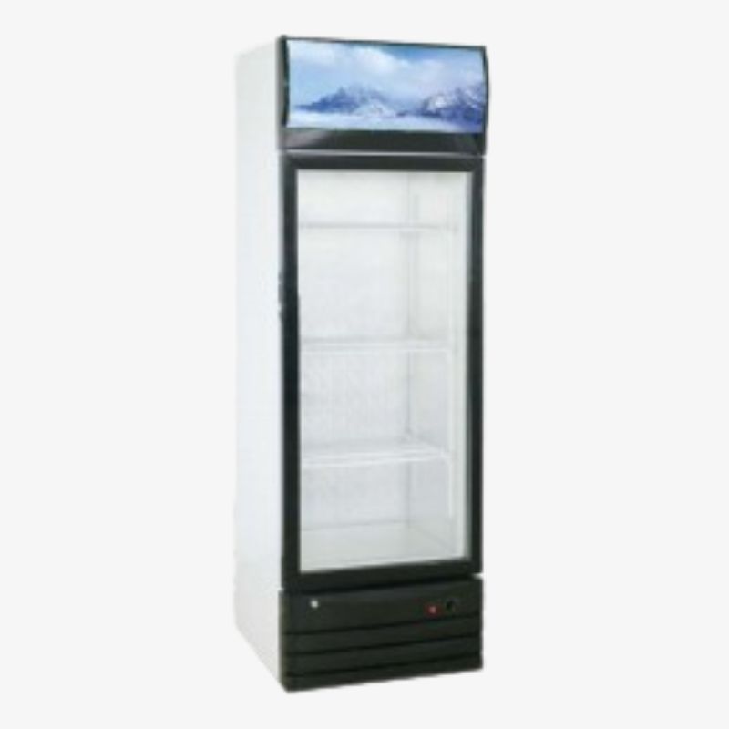 Energy-efficient single door display refrigerator with adjustable temperature control and clear glass display, ideal for retail and food service applications.